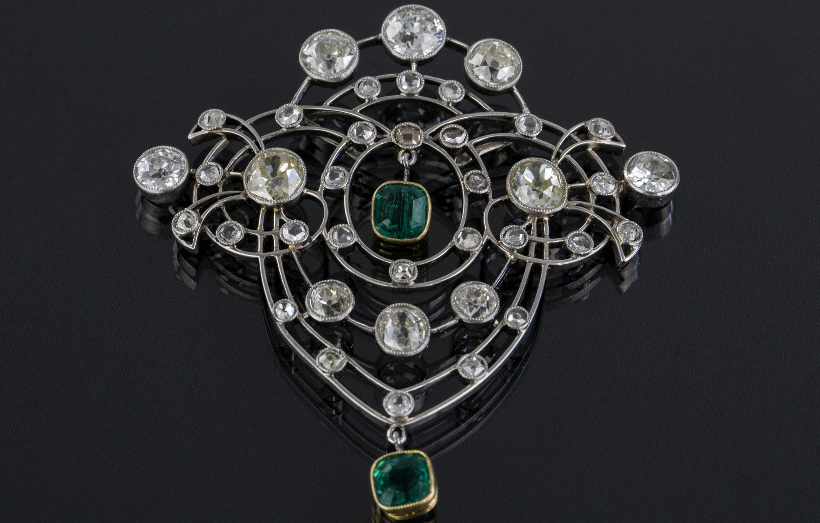 [Nessun Autore] Pendente Art Nouveau in oro bianco e giallo gr 31.13 diamanti per cts 6.2 e due smeraldi per cts 1.80 circa. . -. .