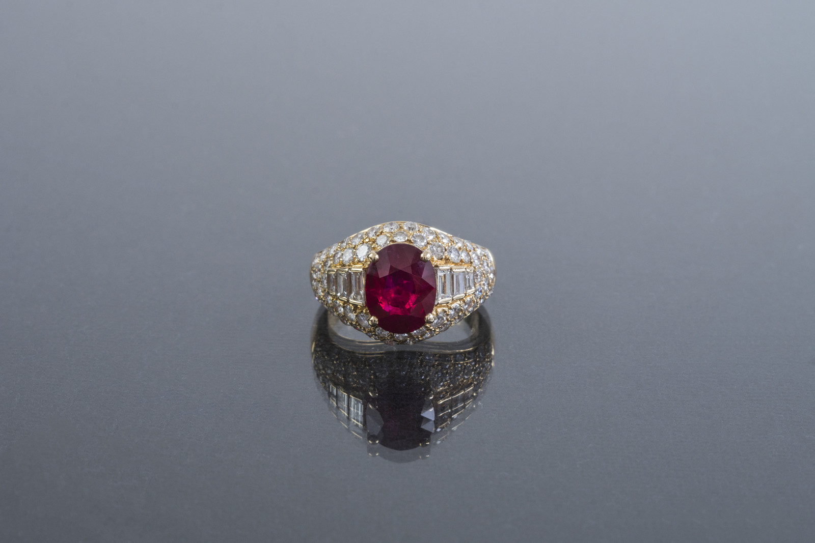 BULGARI Anello in oro giallo 18 kt gr per diamanti per cts con al centro un rubino birmano di cts 3.02. -. .