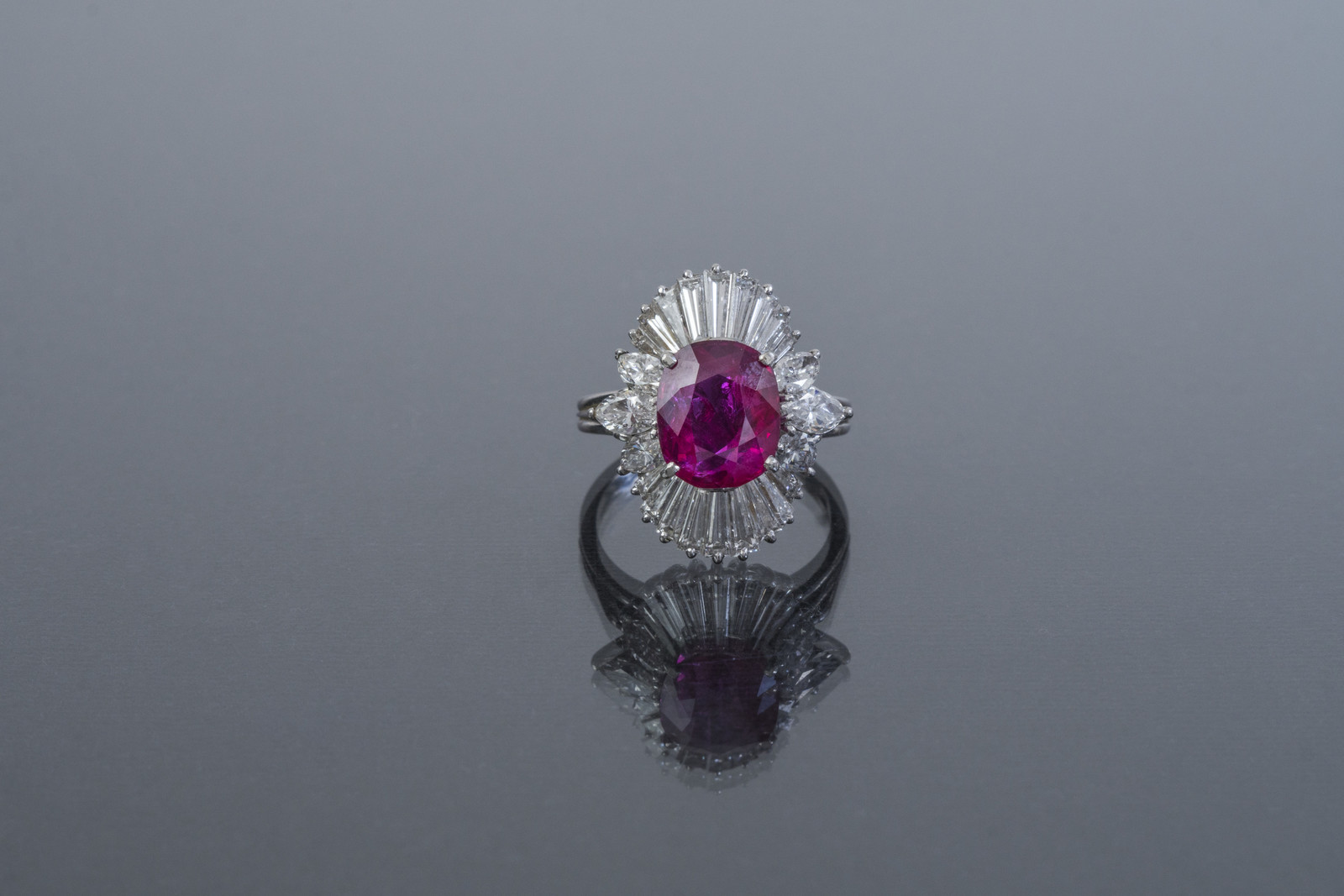 [Nessun Autore] Anello in platino grammi 9 circa con al centro rubino di origine naturale di ct 4.37 circa, diamanti ct 2. . .