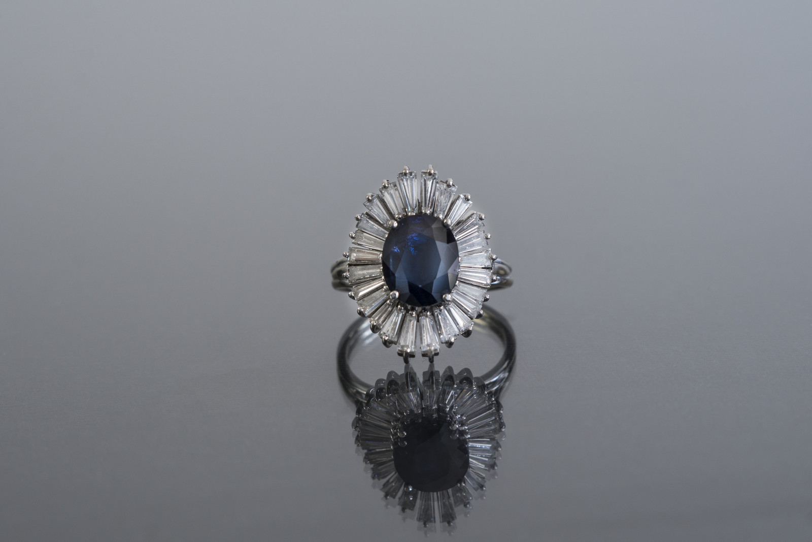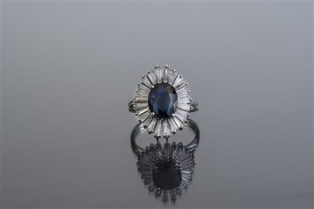 [Nessun Autore] Anello in oro bianco gr 7.20 con uno zaffiro per cts 3.50 circa e diamanti tayper per cts 2.10. -. .