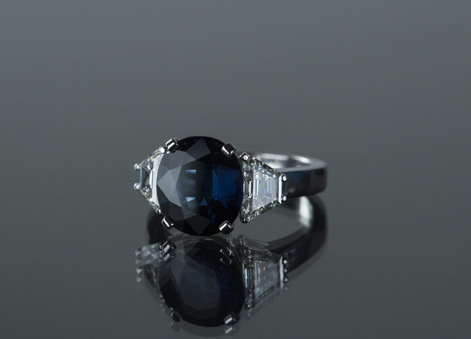 [Nessun Autore] Anello oro bianco gr 6.90 con uno zaffiro per cts 5.53 e due diamanti a trapezio per cts 1.28. -. .