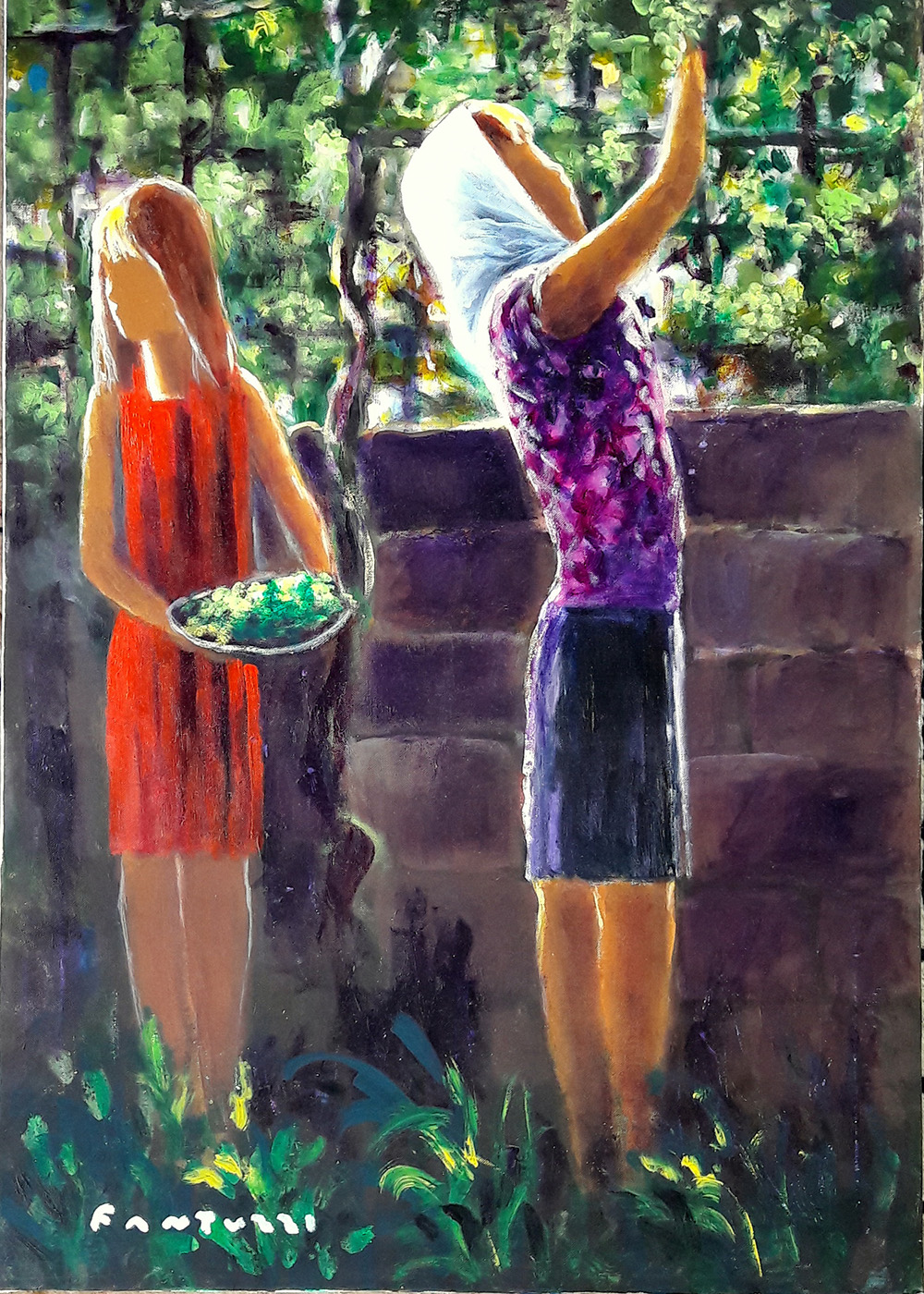 Eliano Fantuzzi "Raccolta dell'uva" - Olio su tela - cm 70x50 - Firma dell'artista in basso a sx - Firma al retro