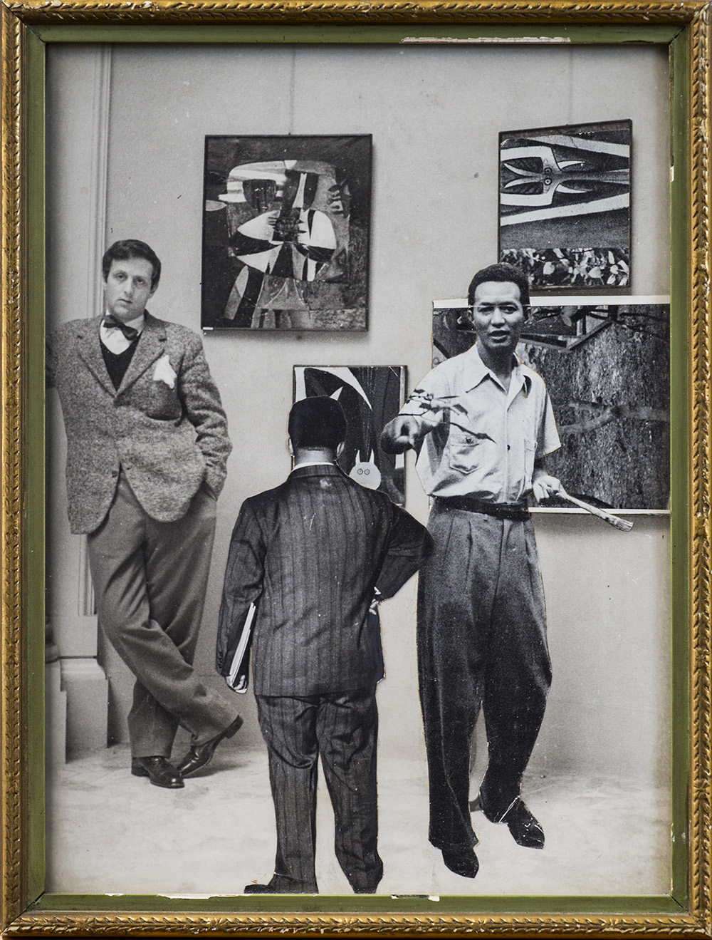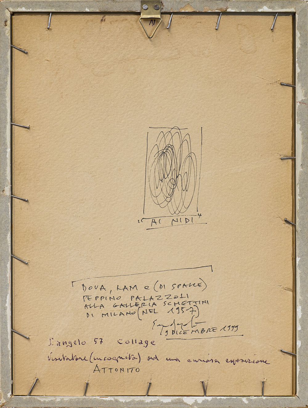 Iscrizione 'Dova, Lam e (di spalle) Peppino Palazzoli alla Galleria Schettini di Milano (nel 1957)' firmata e datata 9 Dicembre 1999 al retro