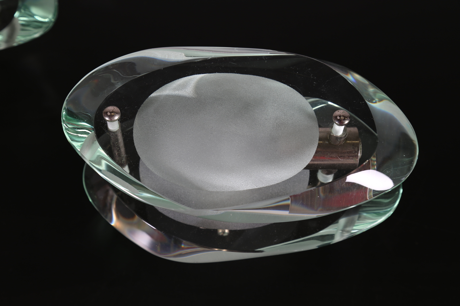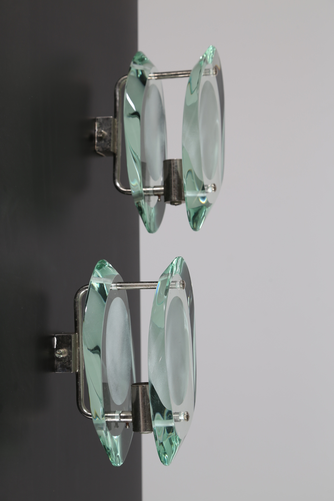 INGRAND MAX (1908 - 1969) Pair of nickel-plated brass appliques with two moulded, polished and internally satinized crystals, mod. 2093, for Fontana Arte, 50’s. Literature; Fontana Arte original catalog.