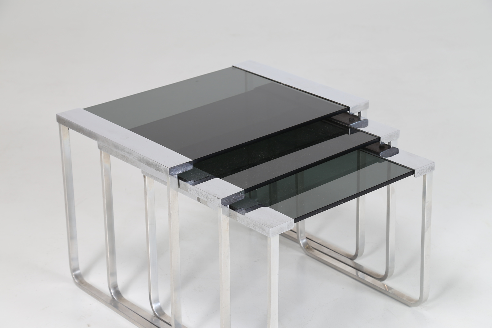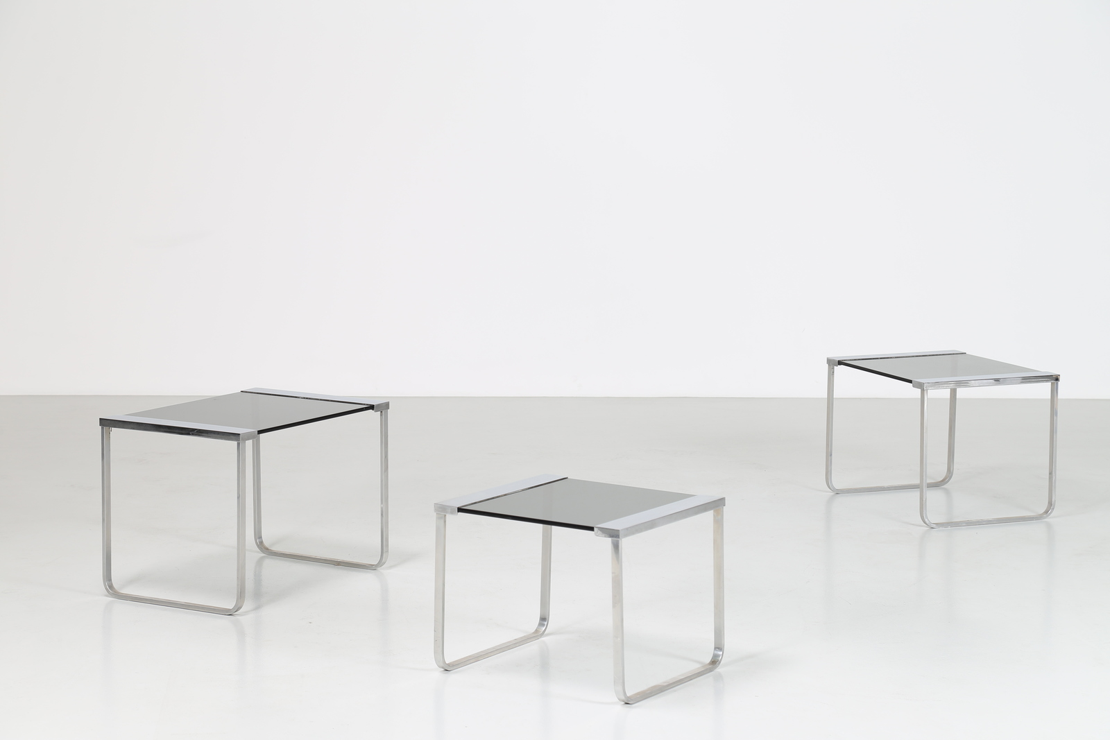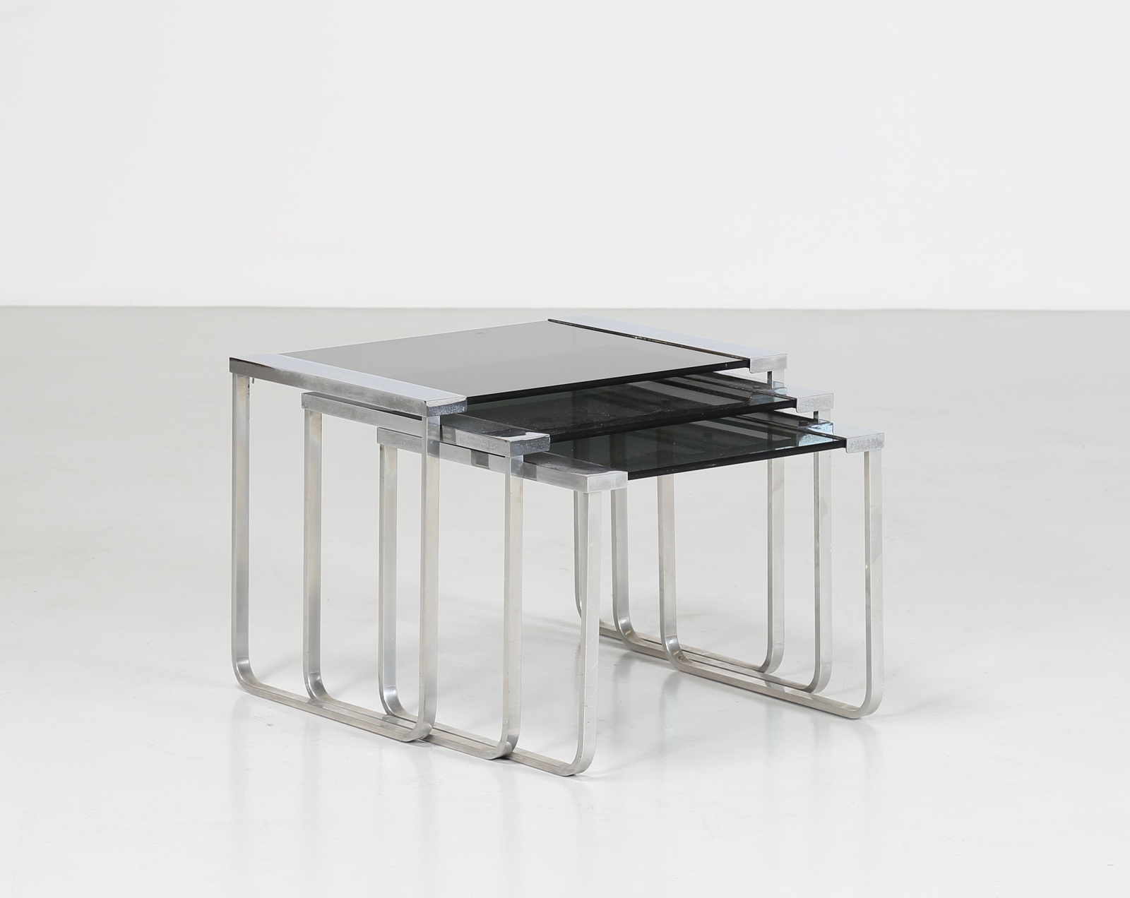 MANIFATTURA ITALIANA Tavolini impilabili in metallo cromato e vetro . -. Cm...