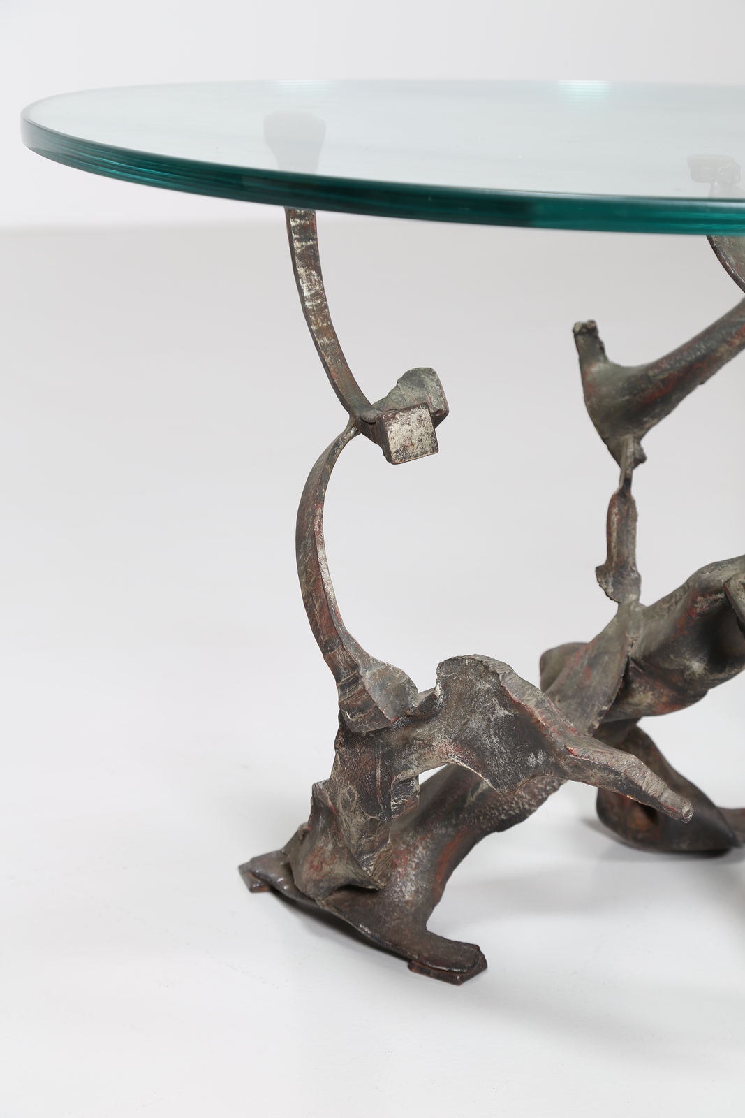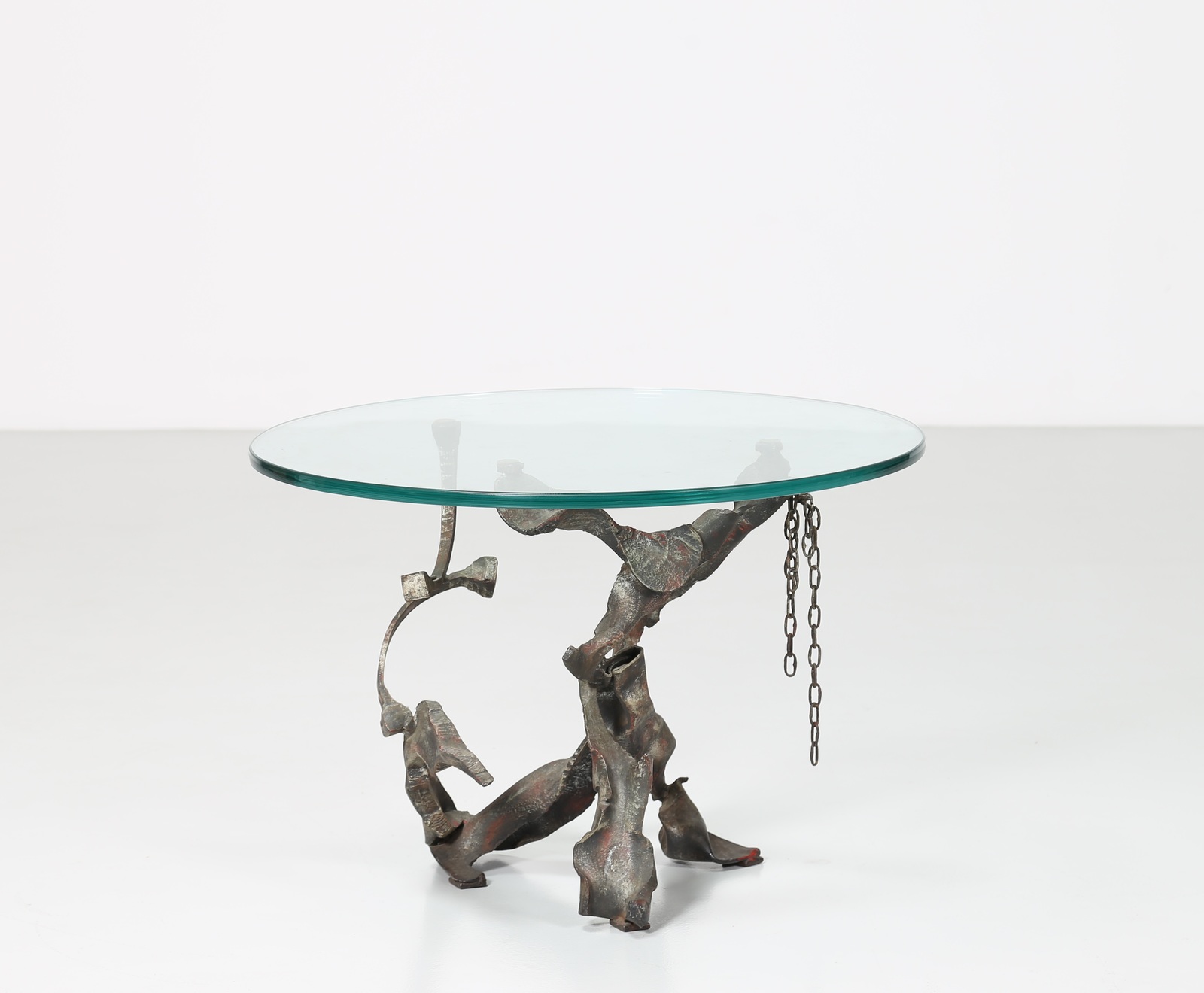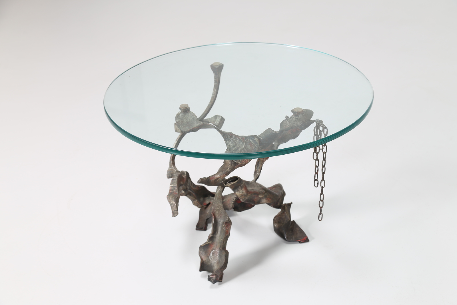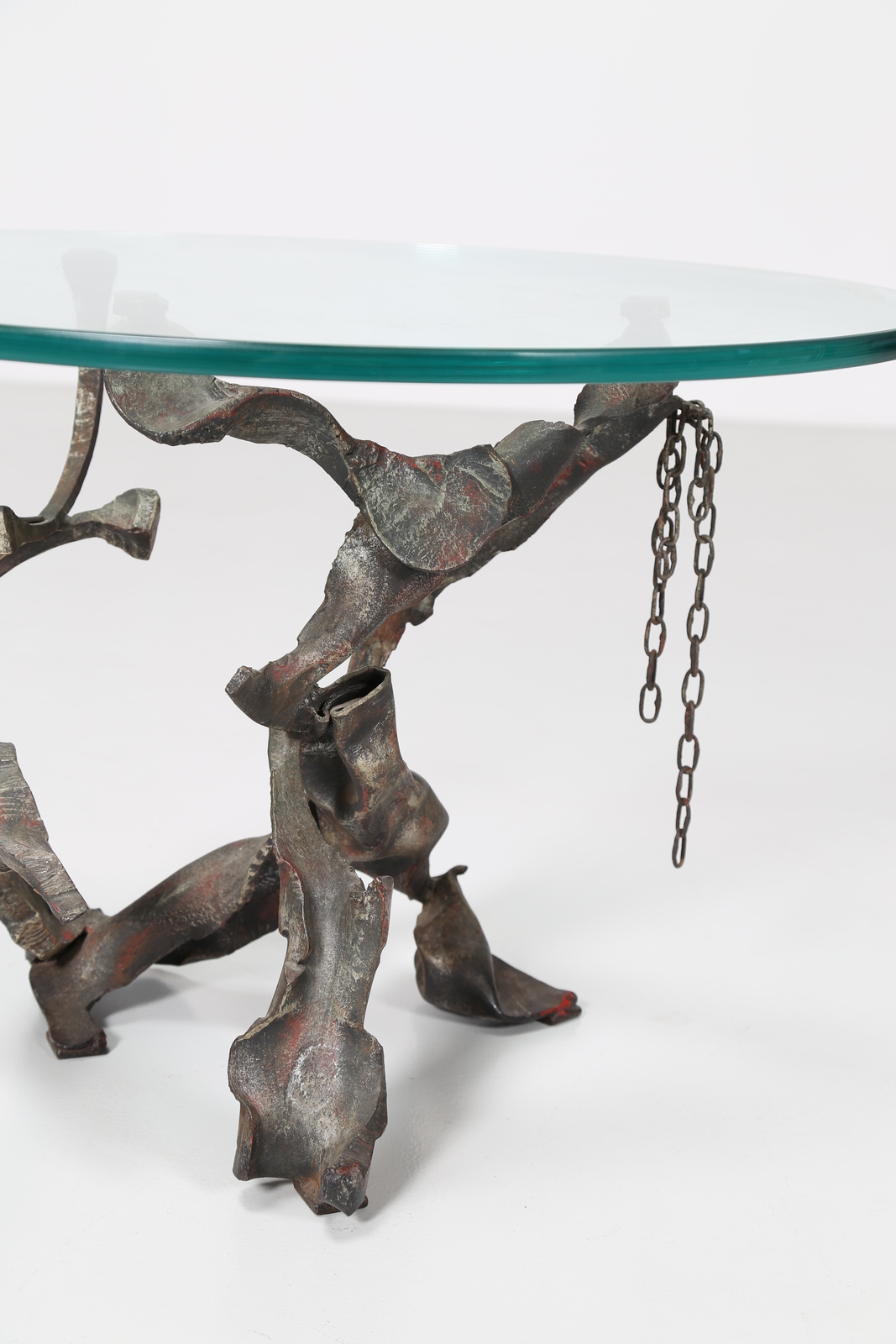 MARSURA SALVINO (n. 1938) Forged iron little table with crystal level, 60’s. . . Cm 69,50 x 47,00 x 69,50.