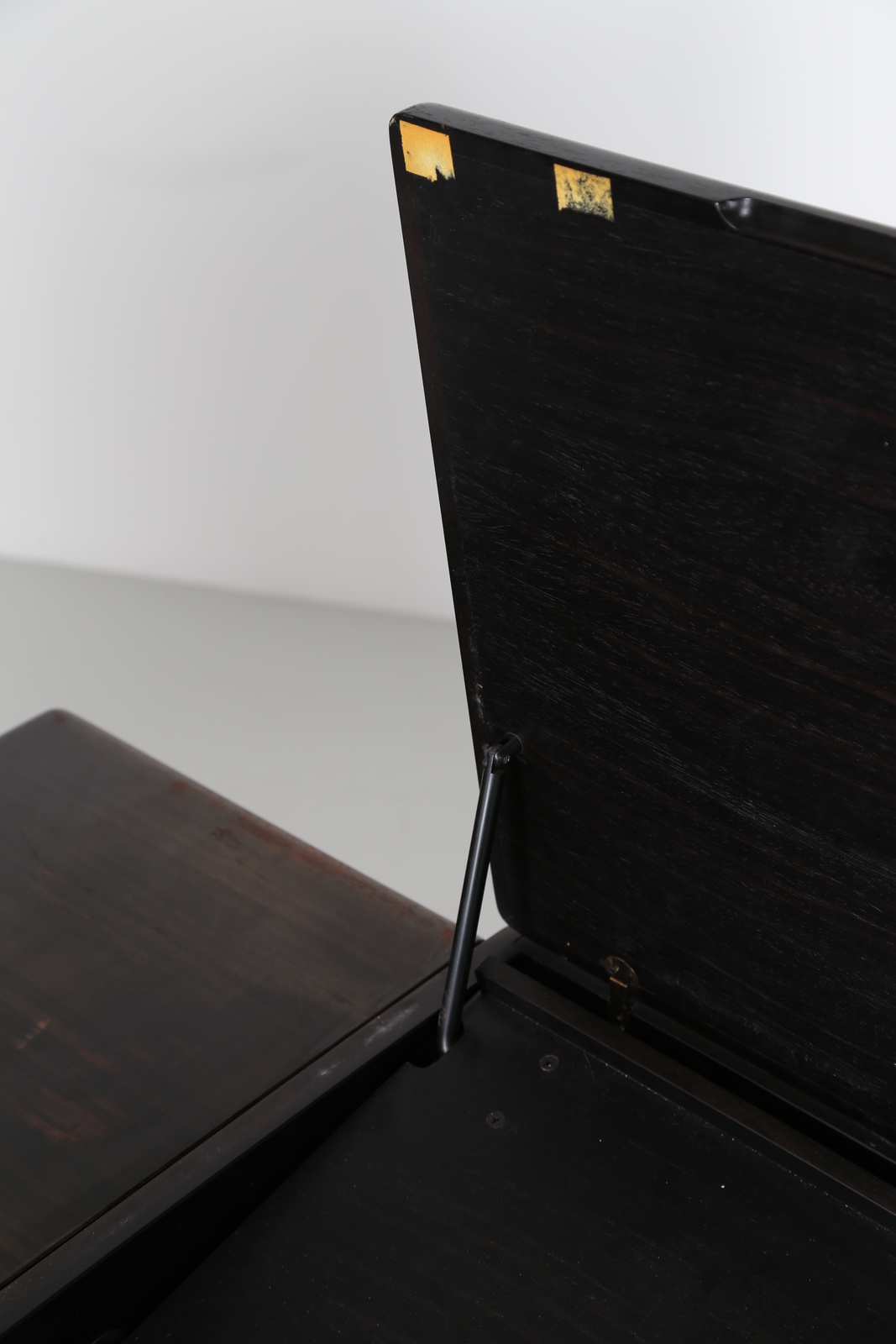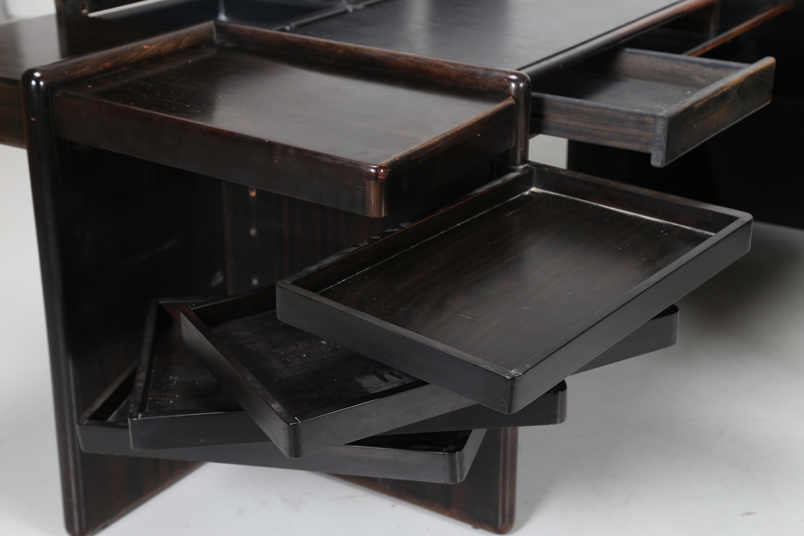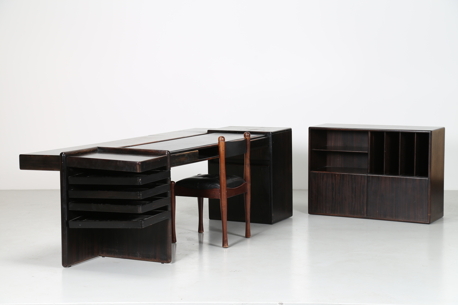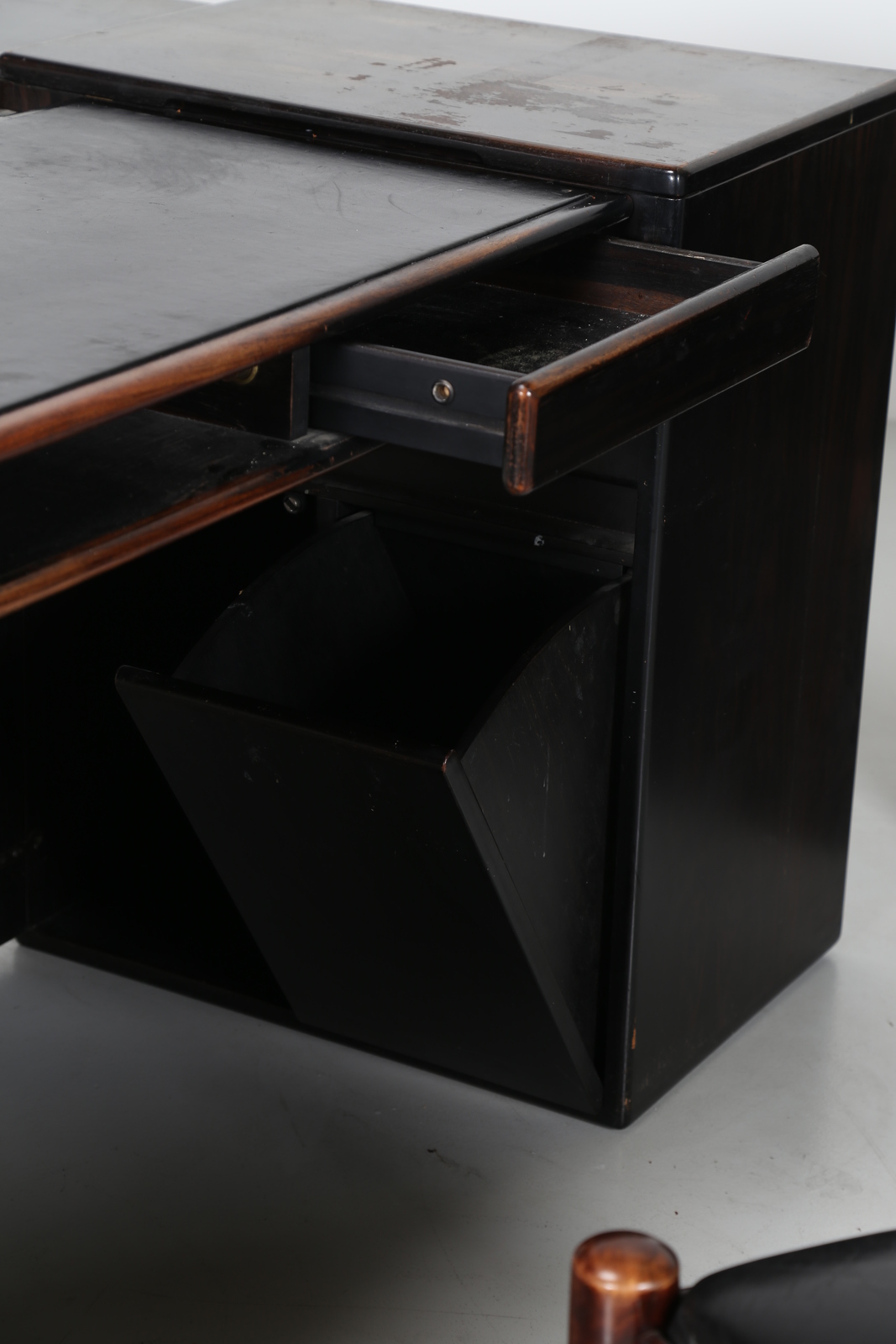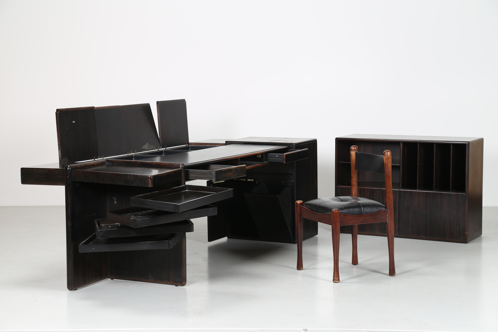 LENCI FABIO Directional writing desk with wood, plastic and leather container piece of furniture and chair, for Bernini, 1974. Literature; Domus num. 537 august 1974 pag. 12. . . Cm 243,00 x 77,00 x 94,00.