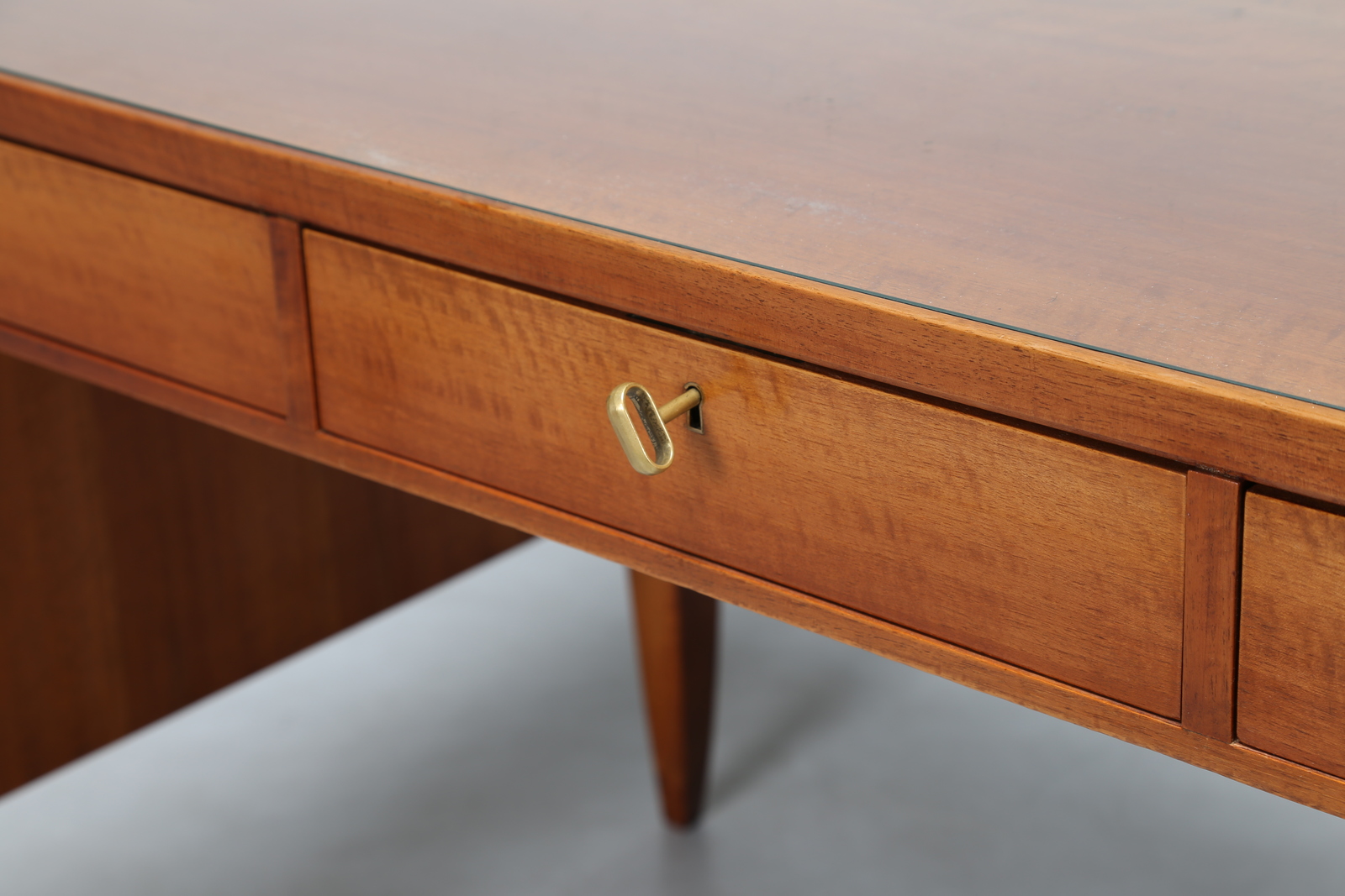 GIO PONTI - EMLIO LANCIA Walnut writing desk with brass details and crystal level, 50’s. Broken top glass level. Expertise examined by Salvatore Licitra Archives Gio Ponti Milan.