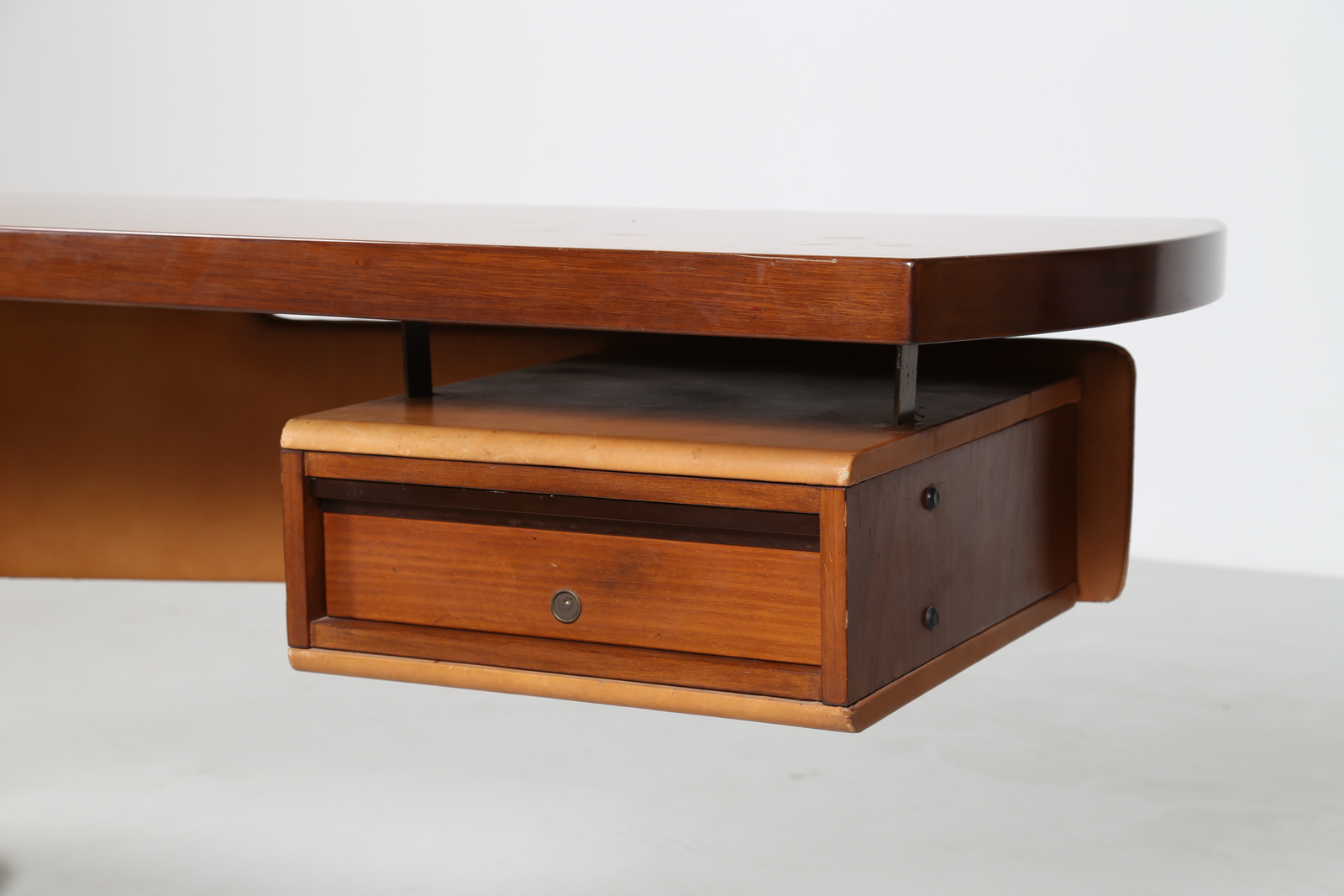 SCHIROLLI RENZO (1934 - 2000) Wood writing deskcovered by sky, painted metal, brass details and marble base, for Schirolli, 60’s. . . Cm 248,00 x 78,00 x 105,00.