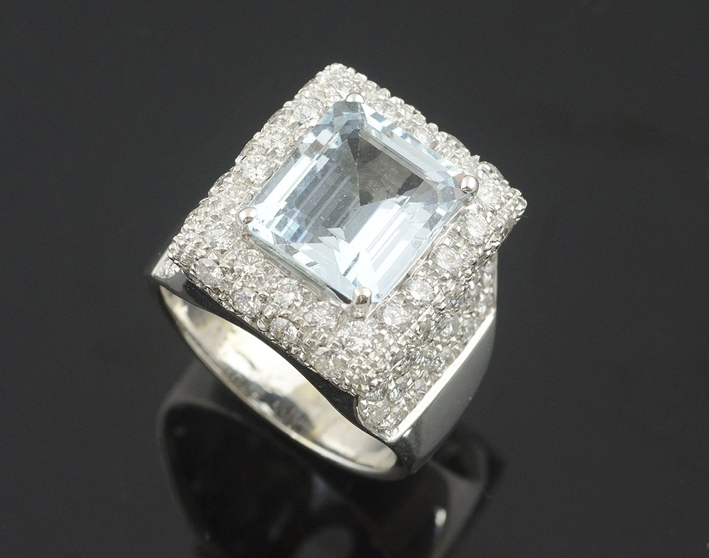 Anello in oro bianco centrato da acquamarina taglio smeraldo per ct 7 con bordi bombati ornati da pavè di 90 brillanti per ca ct 3,80.