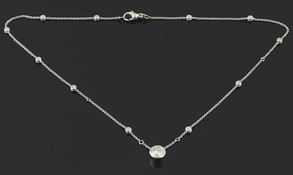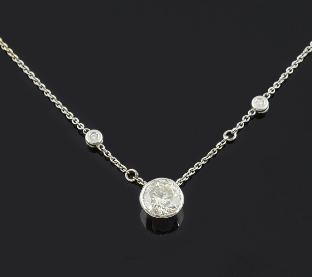 Collana in oro bianco intervallata da diamanti taglio brillante per ca ct 0,50 con pendente centrato da diamante taglio brillante per ct 2, Purezza P2, Colore K