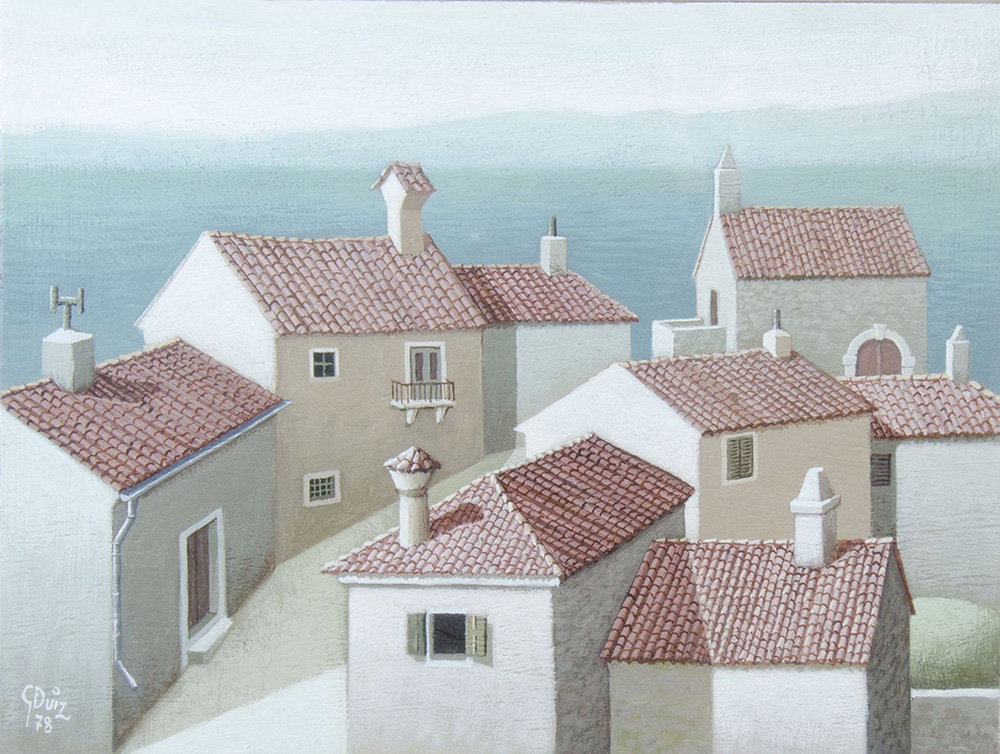 Giovanni Duiz Trieste 1923-2013 "Case sulla costa" cm. 18x24 - olio su compensato Firmato b. a s. e datato '78.