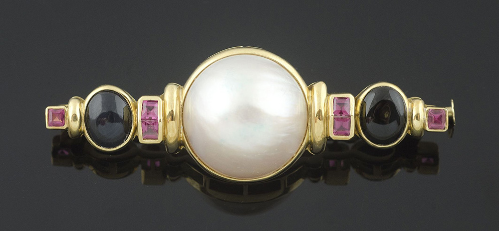 Spilla a barretta in oro giallo con grande perla centrale, ai lati pietre colorate, gr 15,4
