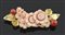 Spilla in oro giallo con motivi di fiori in corallo rosa e ai lati due sfere in corallo rosso, gr 13,5