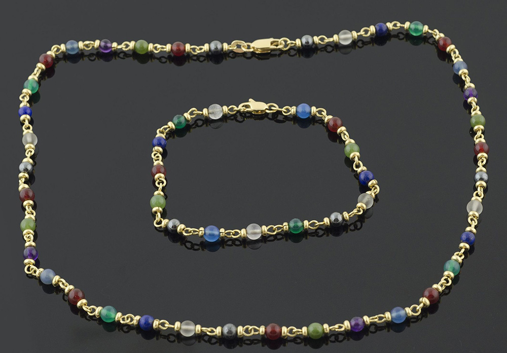 Collana e bracciale oro giallo con perline pietre dure colorate