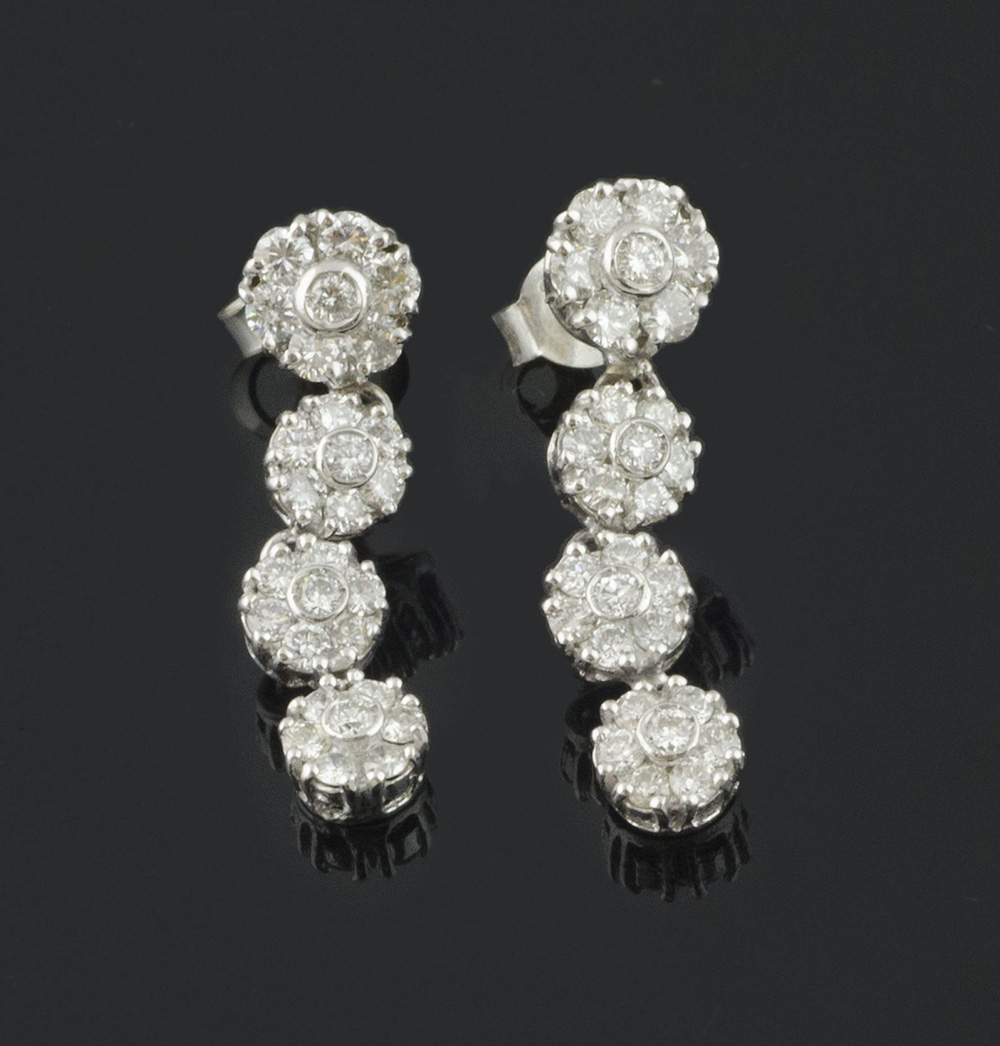 Orecchini in oro bianco a discesa di 4 fiori oscillanti con diamanti taglio brillante per ca ct 1,60
