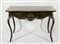 Tavolo-scrivania in legno com piano sagomato su alte gambe a sciabola. cm. 78x115x60.