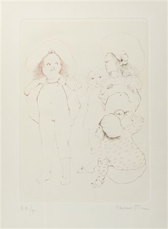Leonor Fini Buenos Aires 1908-Parigi 1996 "Les petites files modelles" cm. 54x37 - incisione Firmato b. a d. Tiratura: 275 esemplari. Pubbl.: "Le livre de Leonor Fini" editions Clairefontaine Vilo Paris 1975, pag. 148.