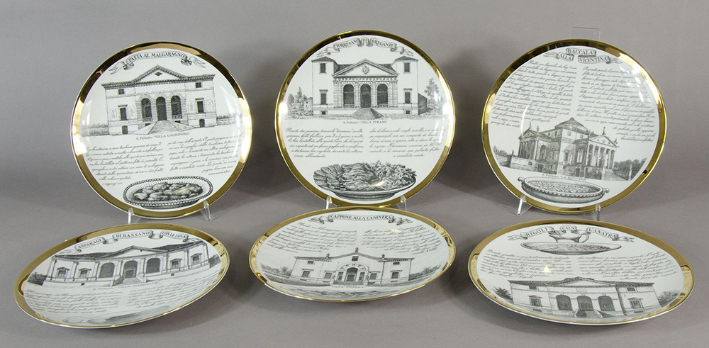 Piero Fornasetti 1913-1988 Lotto di 6 piatti in porcellana della serie "specialità vicentine". Diam. cm. 24,5.