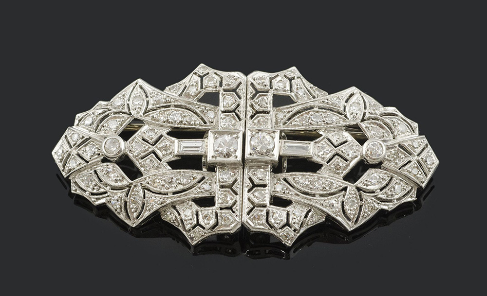 Spilla Decò a barretta in oro bianco ricoperta da diamanti taglio brillante, gr 19