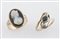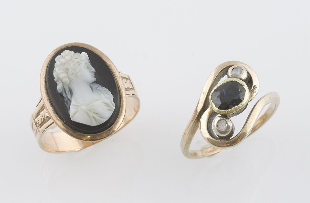 Lotto composto da 2 anelli, uno in oro rosa con cammeo raffigurante figura femminile di profilo e l'altro oro giallo con zaffiro e 2 piccoli diamanti.