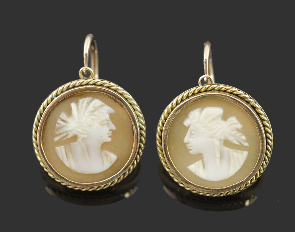 Lotto 181 | Orecchini cammeo con figura femminile di profilo in oro giallo chiusura a...