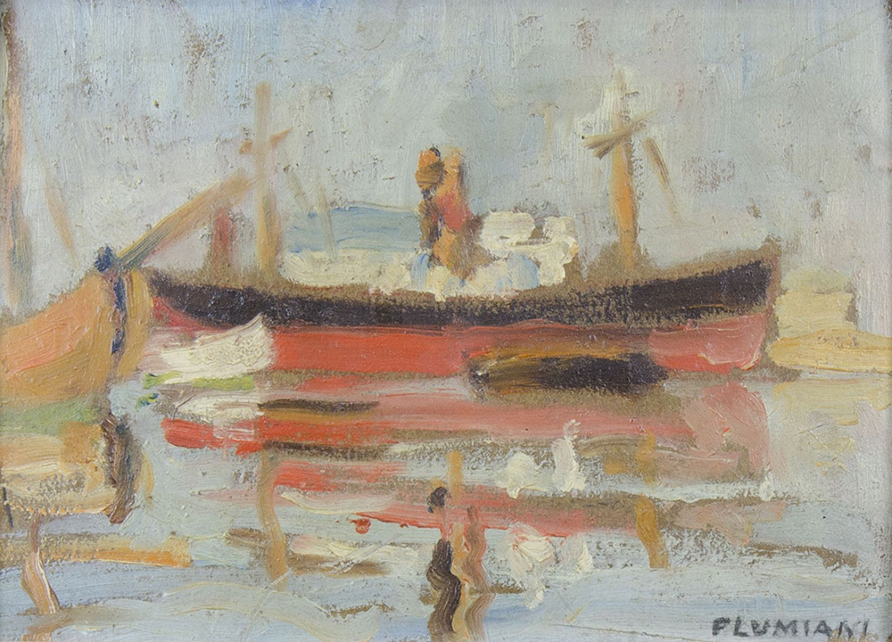 Pittore dell'800 "Barche" cm. 19x25 - olio su cartone Firmato Flumiani b. a d.