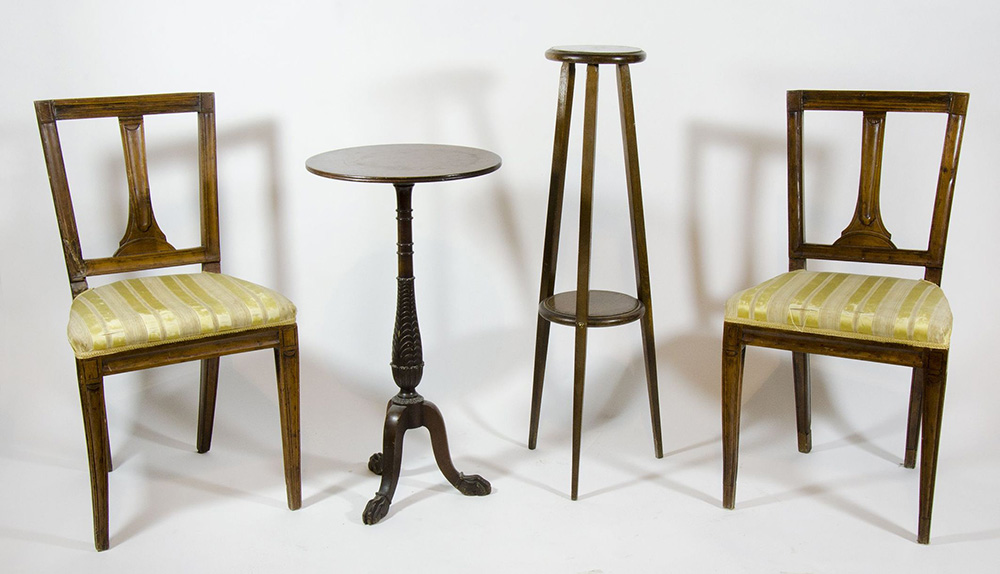 Lotto composto da piccola sedia, tavolino, coppia di sedie e colonna...