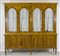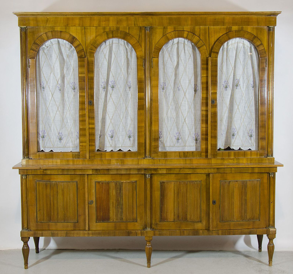 Grande credenza in legno a 2 corpi, parte inferiore a 4 ante scanalate e parte superiore a 4 ante a vetri con taglio a lunetta. cm. 195x203x44.
