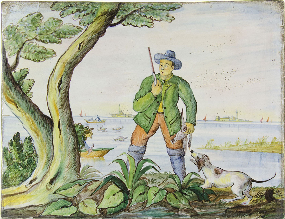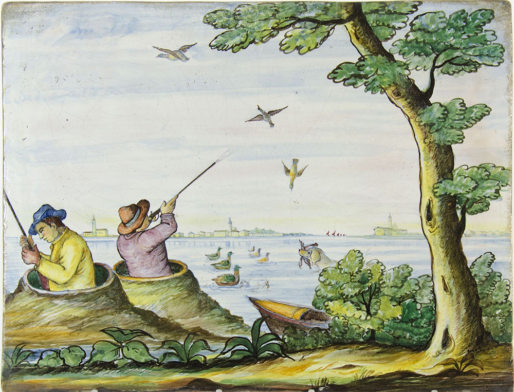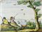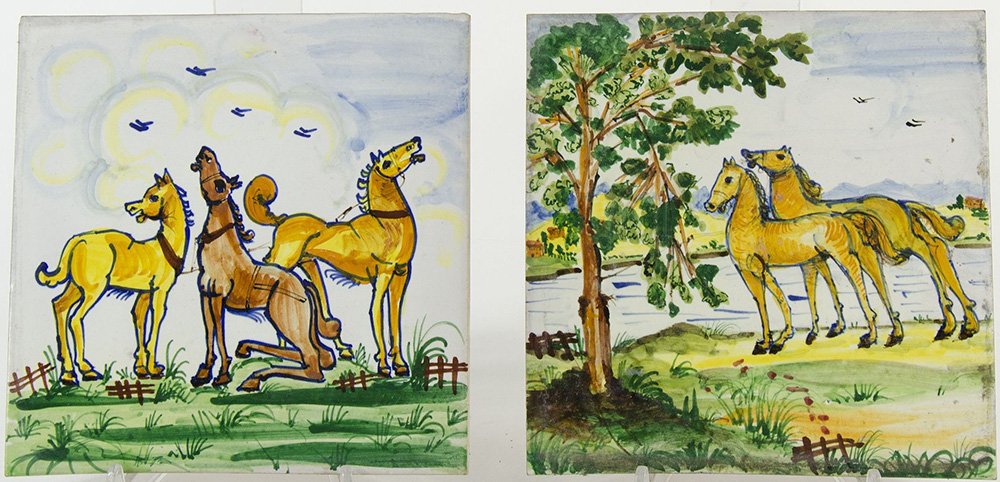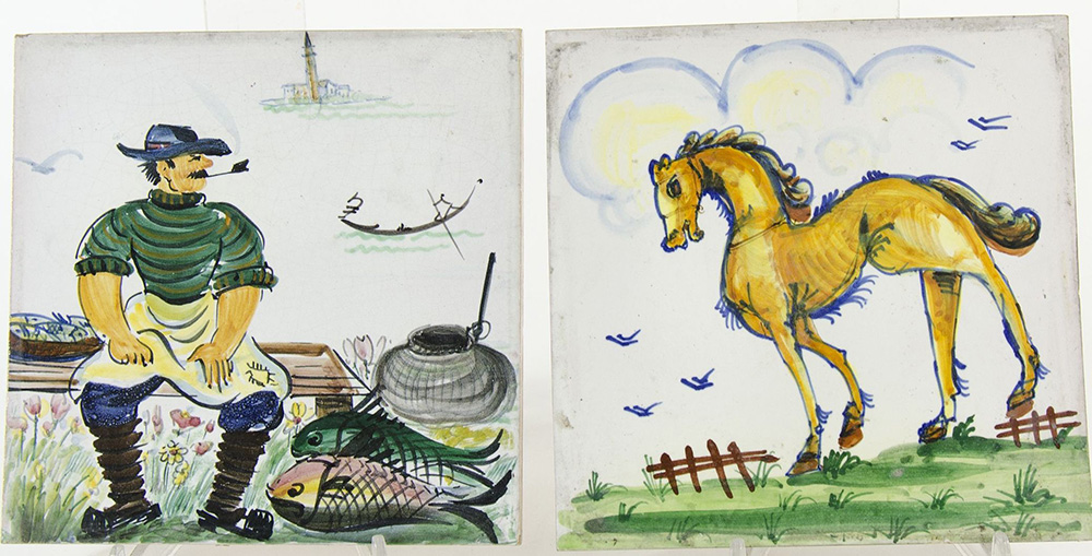 Guerrieri Murano: lotto di 6 piastrelle in ceramica policroma raffiguranti paesaggi. Tutte firmate. Misure diverse.