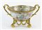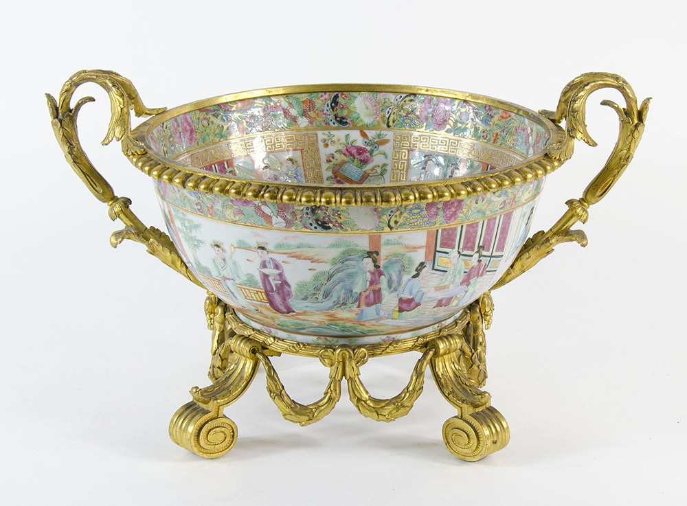 Grande ciotola in porcellana policroma decorata a motivi orientali, montatura in bronzo dorato. Lung. cm. 43.