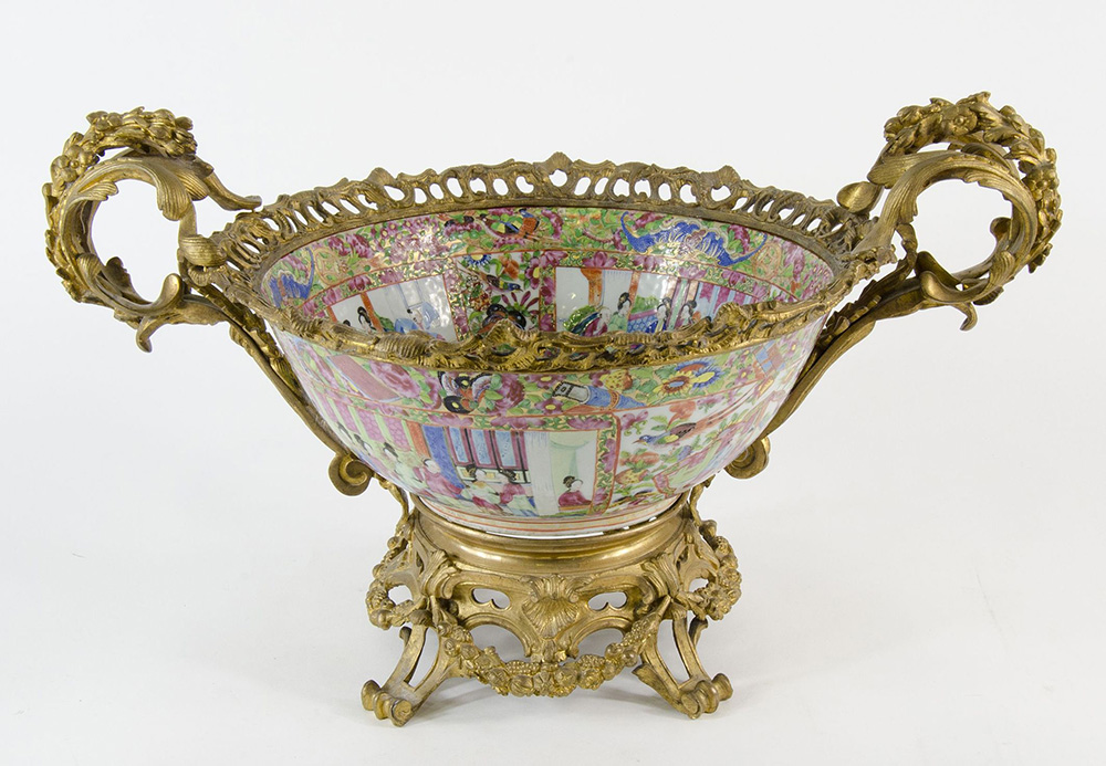 Lotto 355 | Grande ciotola in porcellana policroma decorata a motivi orientali, montatura...