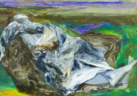 Ennio Calabria Tripoli 1937 Figura Olio su tela, cm. 50x70 Firmato in basso a destra. Sul verso: scritto di Autenticità dell'Artista; Timbro di provenienza. Autentica dell'Artista su foto.