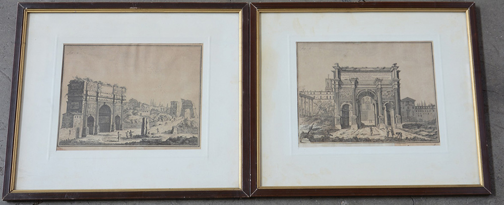 Due incisioni (160x210 mm) in bianco e nero raffiguranti monumenti dell'antichità. In cornici.