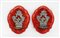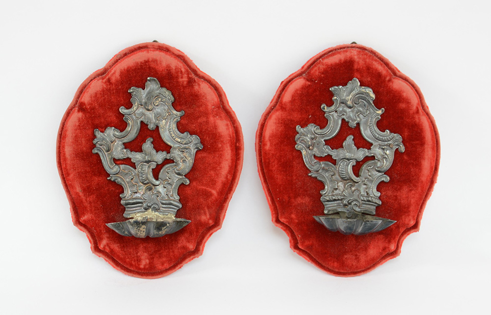 Coppia di canti in argento sbalzati a volute e 'pelacette', saldati a conchiglie per acquasanta non pertinenti. Supporto in velluto. Italia, fine sec. XIX (h cm 12 ca) (difetti)