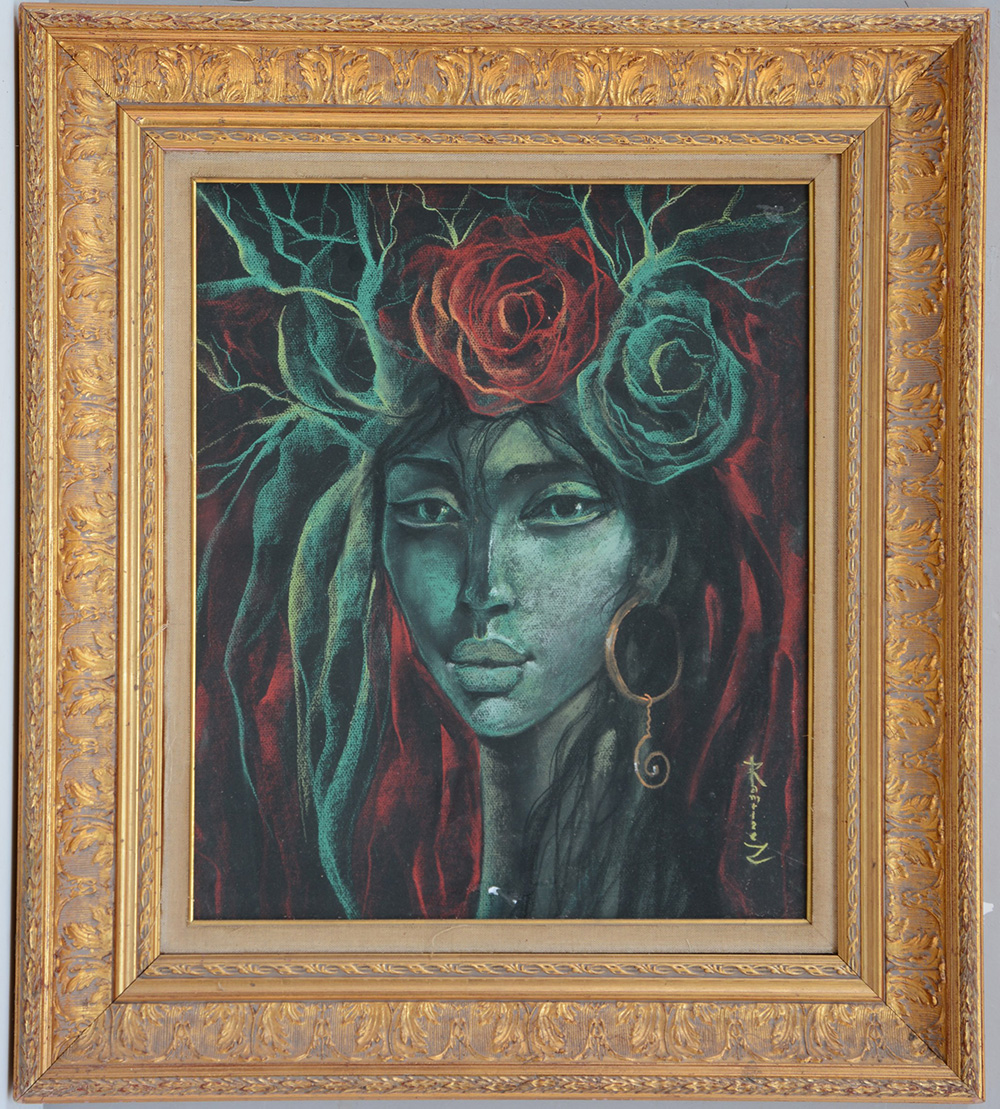 Ignoto "Volto di donna" tecnica mista su cartoncino (cm 55x67) reca firma Ramirez in basso a destra, in cornice (difetti)