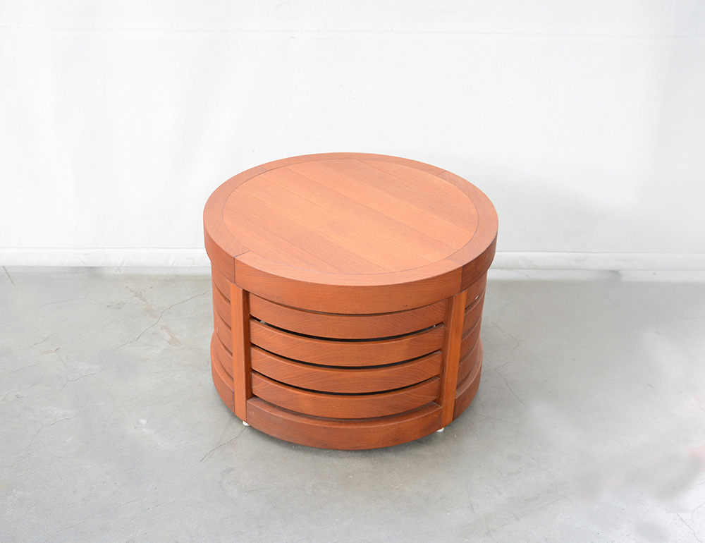 Tavolino da salotto di forma circolare decorato con listelli curvati e...