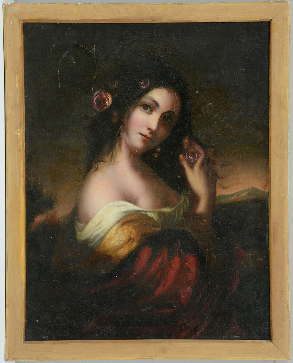 Ignoto "Ritratto di donna con rose tra i capelli" olio su tela (cm 63x49) in cornice (difetti)