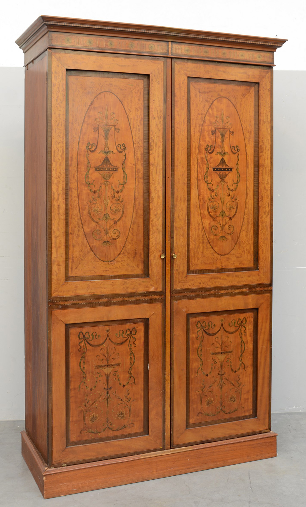 Armadio lastronato e filettato decorato a motivi floreali, fiori e volute a due ante riquadrate sul fronte. Fine sec. XIX (cm 130x206x54)(difetti)