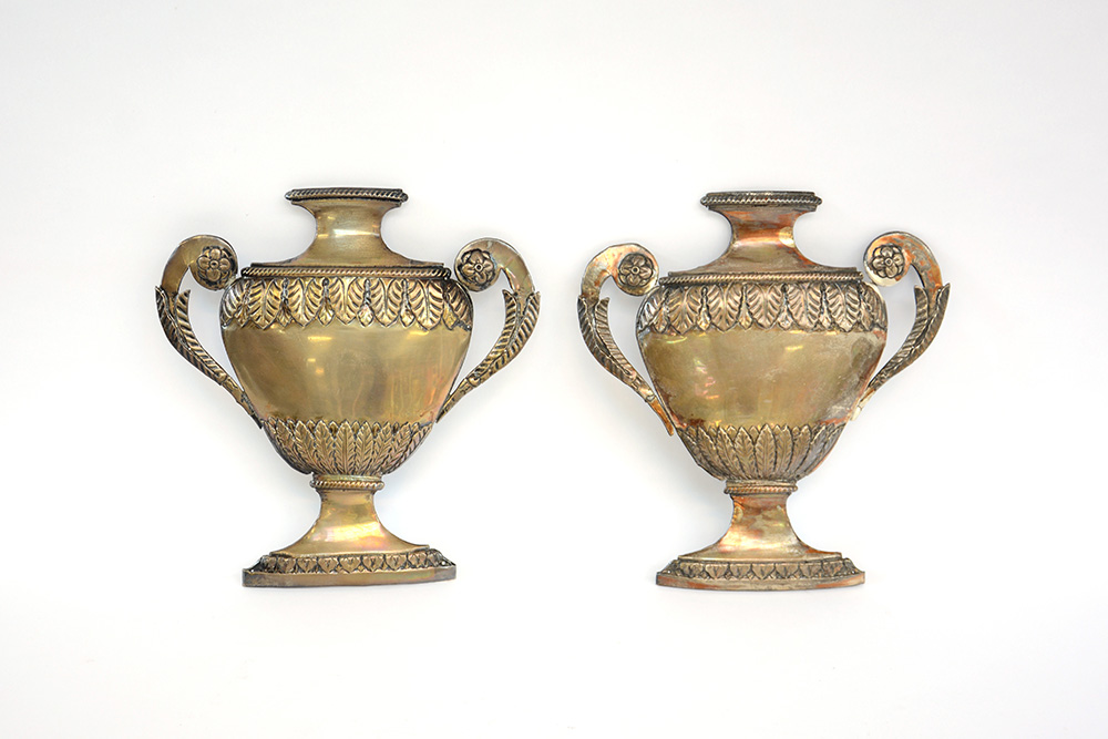 Coppia di fregi in argento sbalzato a forma di vasi biansati con decoro a palmette (gr 340) (difetti)