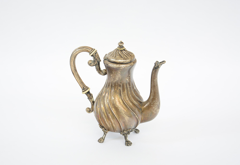 Teiera in argento con corpo piriforme, presa a volute e piedini felini (gr...