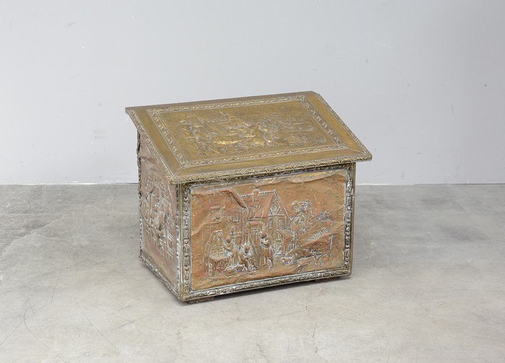 Cassa porta carbone rivestita in lamina in ferro sbalzato e raffigurante scene di vita (cm 60x49x36) (difetti)