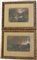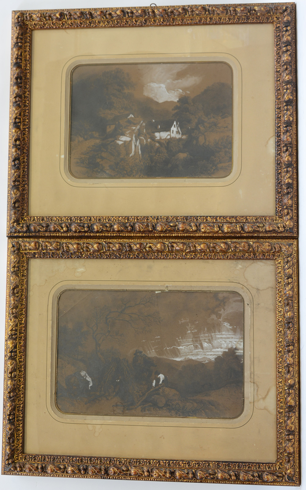 Scuola della fine del secolo XIX "Paesaggi con case e figure" coppia di disegni a matita e biacca su cartoncino (cm 28x38) uno reca firma indecifrata in basso a sinistra, in cornici (difetti)