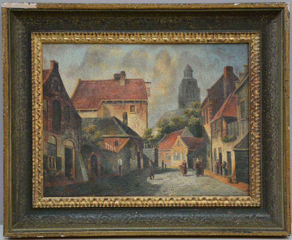 Ignoto "Scorcio di villaggio nord europeo" olio su tela (cm 30x40) in cornice (difetti)
