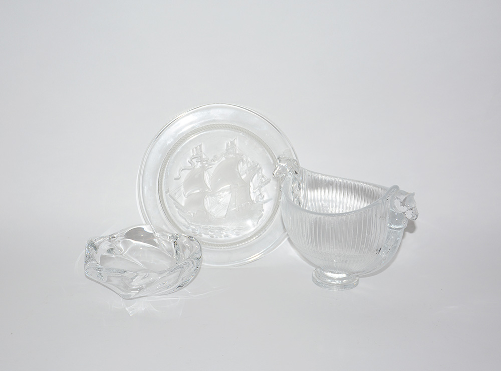 Lotto composto da un piatto decorato con veliero, firmato Lalique (d cm 22), un posacenere in cristallo e un'alzatina in vetro con anse a testa di cavallo