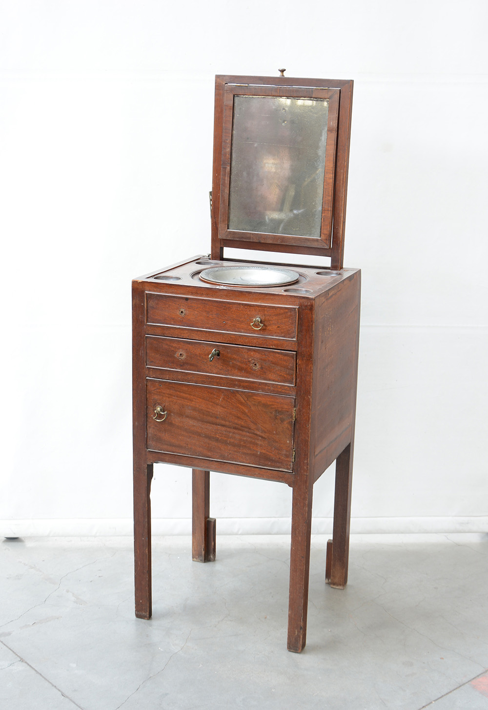 Mobiletto toilette ad uno sportello, un cassetto ed un finto cassetto, specchierina a scomparsa, bacile in peltro, fine sec XIX (cm 43x84x38) (difetti e mancanze)