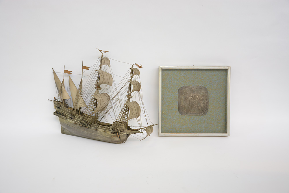 Lotto composto da un modello di veliero in metallo e una placca in metallo decorata a bassorilievo (difetti)