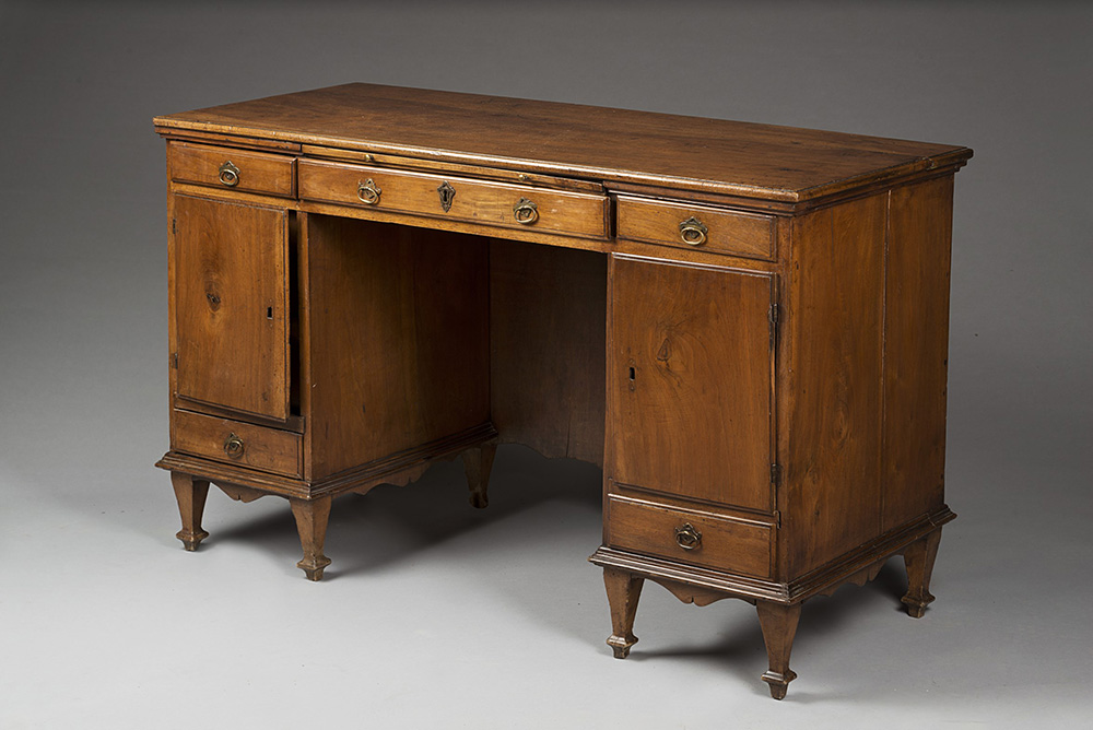 Scrivania in noce da centro di forma rettangolare con tiretto e cassetto sottopiano, montanti a due cassettini e due ante, fascia e piedini sagomati (cm 132x80x58) Fine sec. XVIII (difetti e restauri)