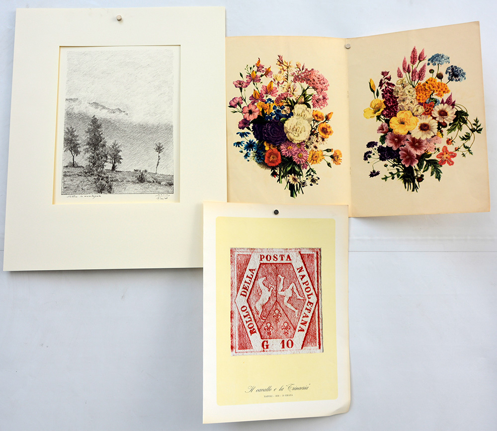 Lotto composto da una cartella editoriale illustrante l'opera di Quinto Savio, un'edizione sui francobolli dell'Ottocento e alcune stampe riproducenti fiori (difetti)