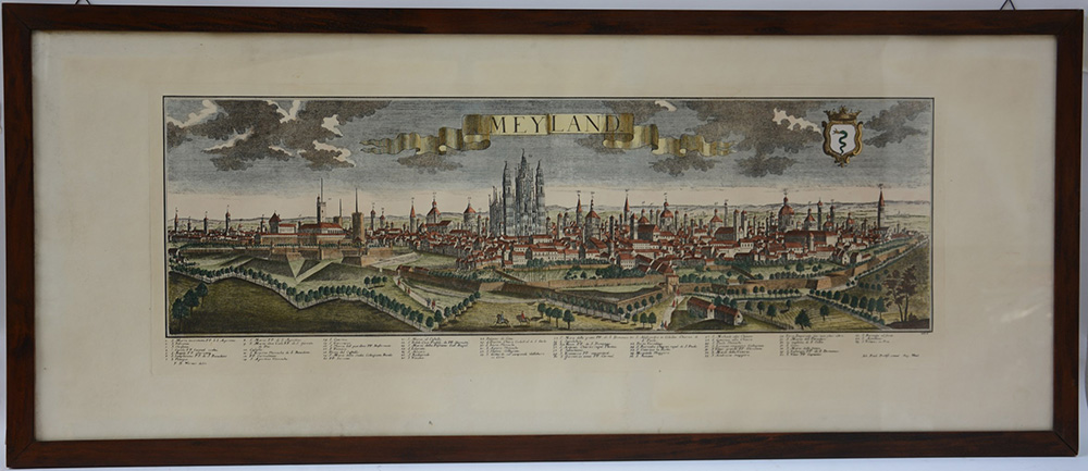 Incisione raffigurante uno scorcio di Milano a volo d'uccello (cm 48x124)